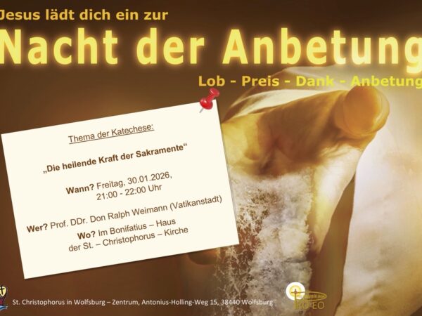 Am 30./31. Januar 2026 laden wir wieder zur Nacht der Anbetung ein. Das Thema des Vortrages lautet: “Die heilende Kraft