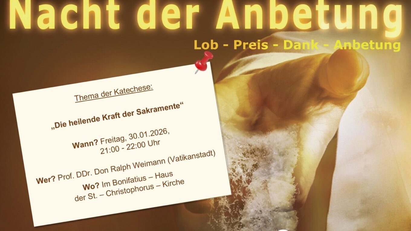 Am 30./31. Januar 2026 laden wir wieder zur Nacht der Anbetung ein. Das Thema des Vortrages lautet: “Die heilende Kraft der Sakramente“. Der Vortrag wird von Prof. DDr. Don Ralph Weimann aus der Vatikanstadt im Bonifatius-Haus gehalten. Im Anschluss an die Heilige Messe besteht die Möglichkeit, Devotionalien segnen zu lassen.